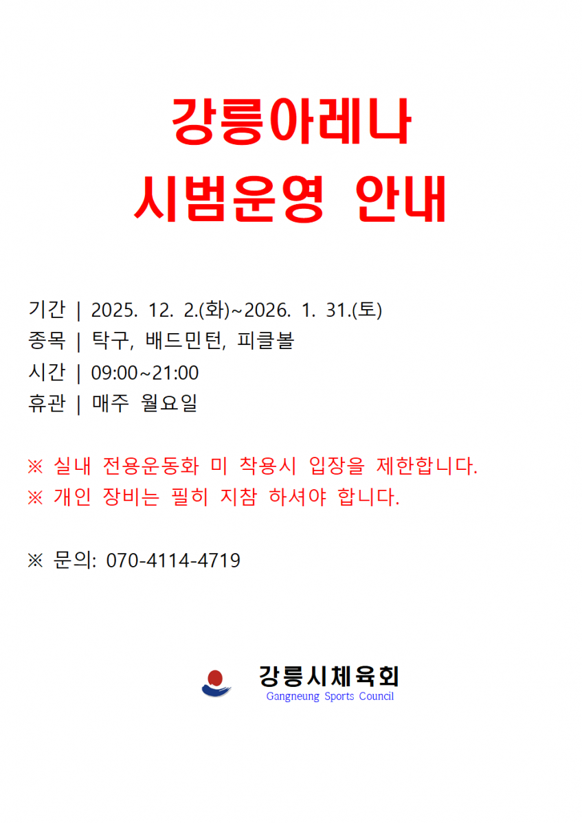 | 공지 | 2025년 강릉시체육회 회원종목단체 워크숍 공지 | 관리자 | 12-05 | 62 |