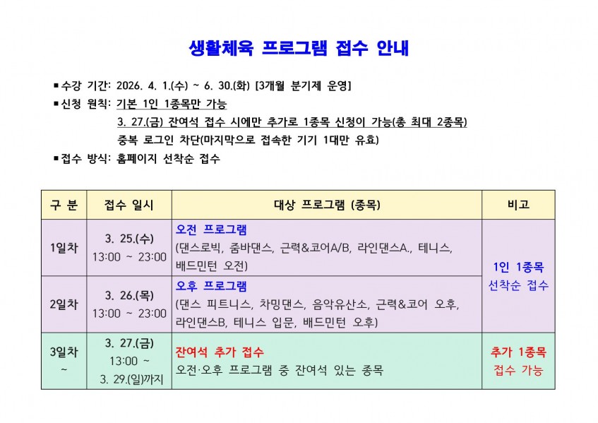 변경된 생활체육 프로그램 접수 안내 드립니다.