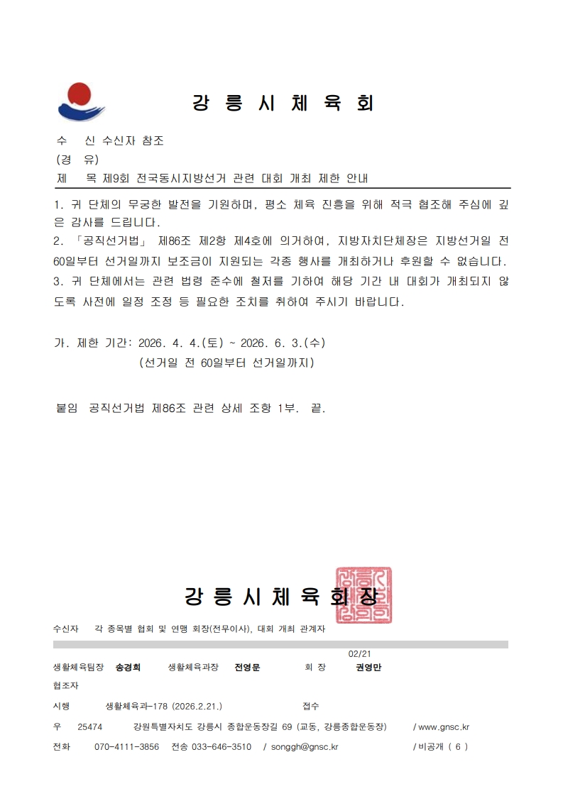 2026년 제9회 전국동시지방선거와 관련하여 대회 개최 제한 사항을 안내드립니다.
